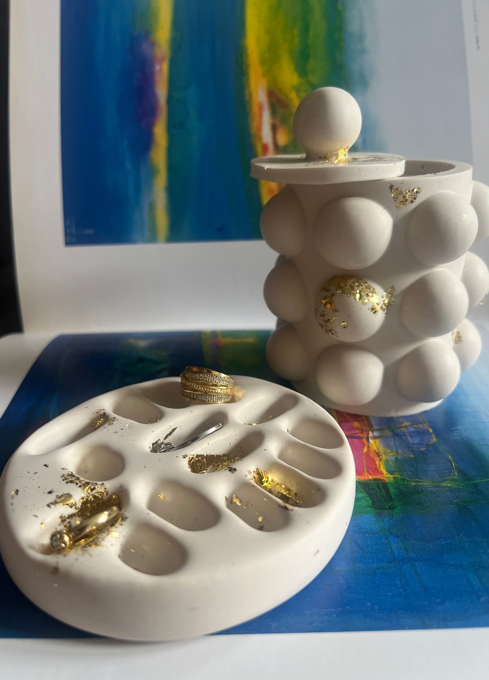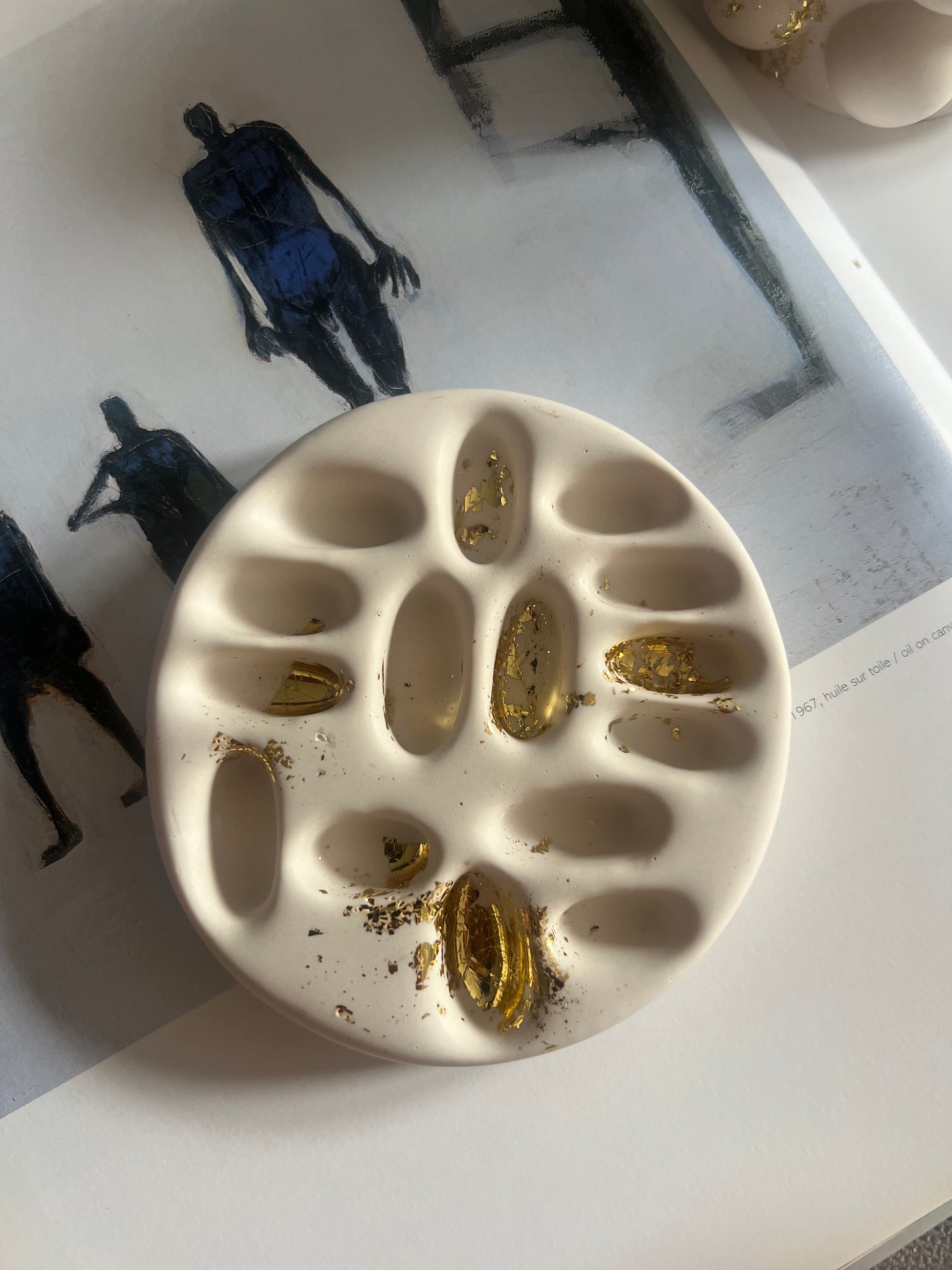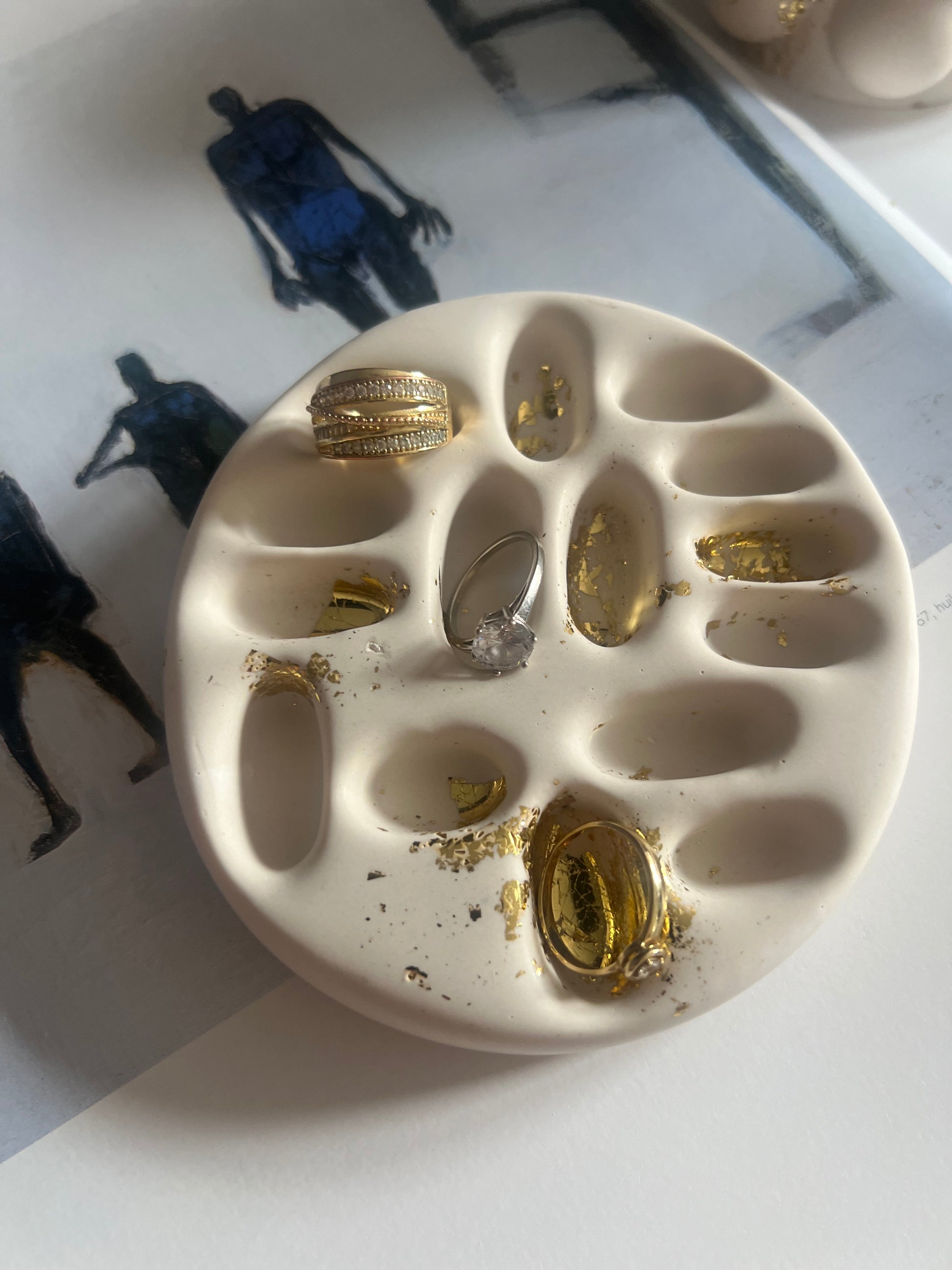 ALBA un porte-bague en Jesmonite, façonné à la main, rehaussé d'éclats dorés qui accrochent la lumière comme les premiers rayons du matin.Chaque pièce est unique, avec ses reliefs, ses imperfections et son éclat singulier.Alba n'est pas seulement un objet pratique pour accueillir vos bijoux. C'est aussi une petite sculpture, un fragment de lumière posé sur votre table de chevet ou dans votre intérieur.